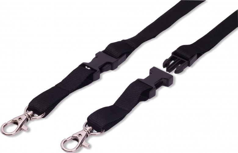 Plochá šňůrka s karabinkou černé barvy. Šířka sňůrky 20 mm, délka 90 cm..