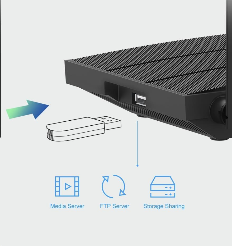 • USB port pro připojení flash disku či HDD (media server, storage sharing, FTP server)