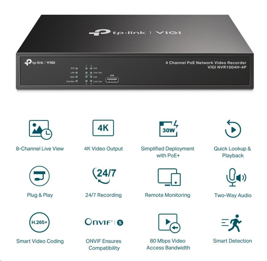 TP-Link VIGI NVR1004H-4P-2TB, videorekordér, 4 channels, 4xPoE, 1xSATA, 1x100Mb/s LAN, 2xUSB2.0, 1xHDMI,1xVGA