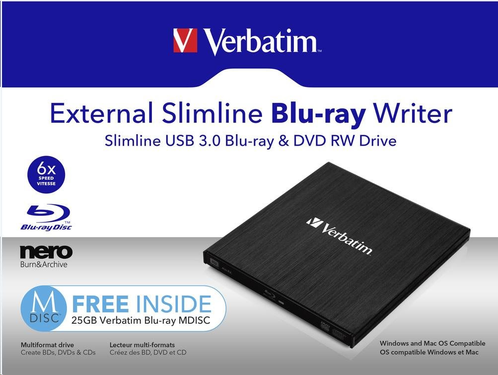 VERBATIM externí mechanika Slimline Blu-ray Rewriter USB 3.0 Zdarma BR Disc 25GB (CD DVD BD Mdisc) +NERO