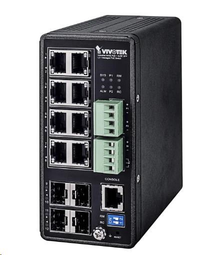 Vivotek AW-IHT-1271, Industriální switch 8xGbe POE (budget 240W, 802.3af/at) + 4x SFP, management L2+,