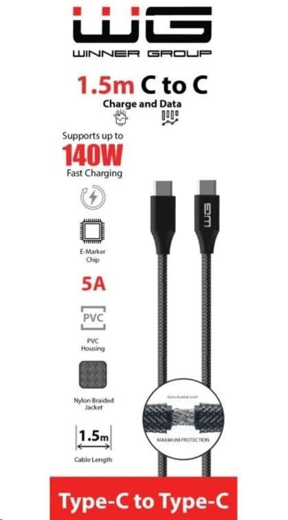 WG - Datový kabel Type-C na Type-C, 1,5 metrů, 5A, 140W, černá