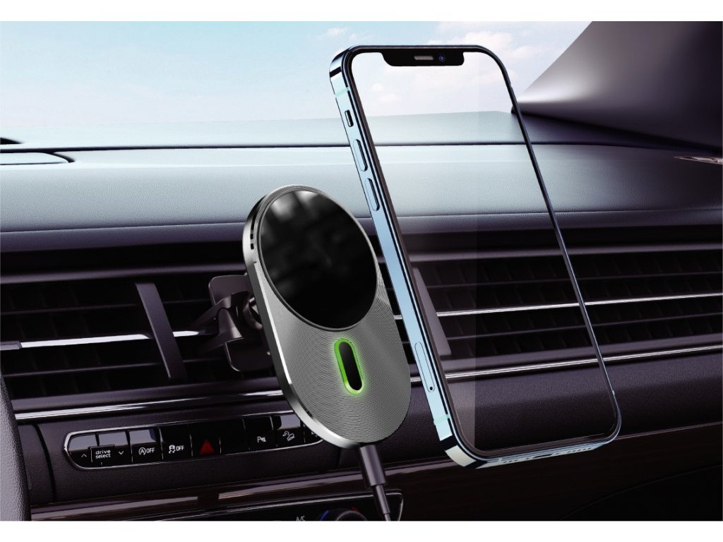 Magnetický autonabíječka v šedo-černé barvě s podporou bezdrátového nabíjení je kompatibilní s Apple iPhone 12 a novějšími. Instalace do mřížky je rychlá a snadná. Držák je třeba připojit k nabíječce do auta, proto je součástí balení datový kabel USB-A/USB-C o délce 1 m. Smartphone se k držáku připevňuje pomocí magnetu. Pokud na svém mobilním telefonu nemáte kryt s magnetickým kruhem (MagSafe), nezoufejte, součástí balení je také náhradní lepicí proužek. Výkon nabíječky je 15 W.